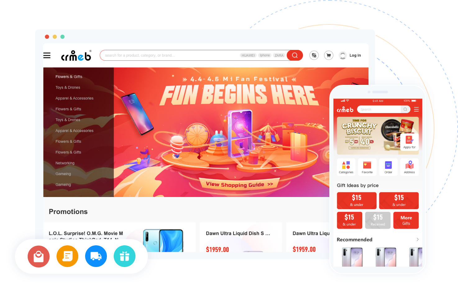 结合各大主流跨境电商平台的界面特点,注入CRMEB独创设计思维,打造出符合国际化标准的跨境电商展示界面